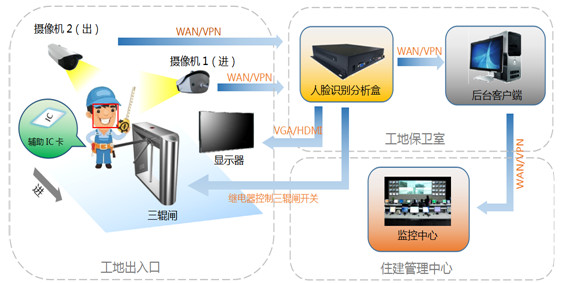建筑工地出入口人臉識別考勤門禁系統(tǒng)主要是由高清抓拍攝像機、人臉識別分析盒、顯示器、三輥閘、人臉識別后臺客戶端;拓撲如下: